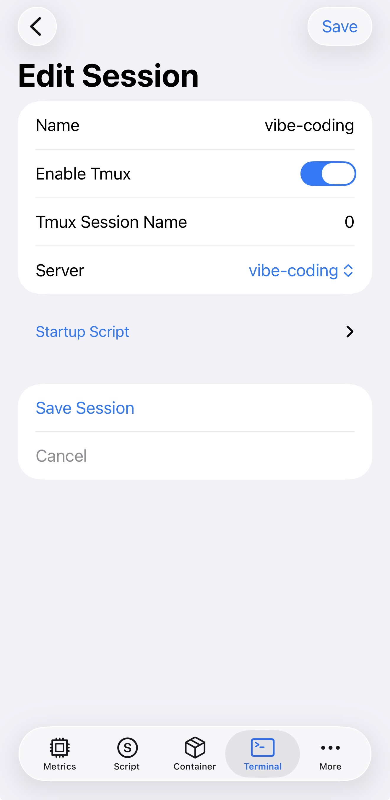 The specialty of NeoServer is that it supports launch or attach to a tmux session directly when connecting to the remote machine. This is very useful because you can keep your coding session alive even when you disconnect from ssh and with one click to go back to the workspace. At the same time, it has a special tmux-optimized command mode to make it easier to use tmux on iPhone.