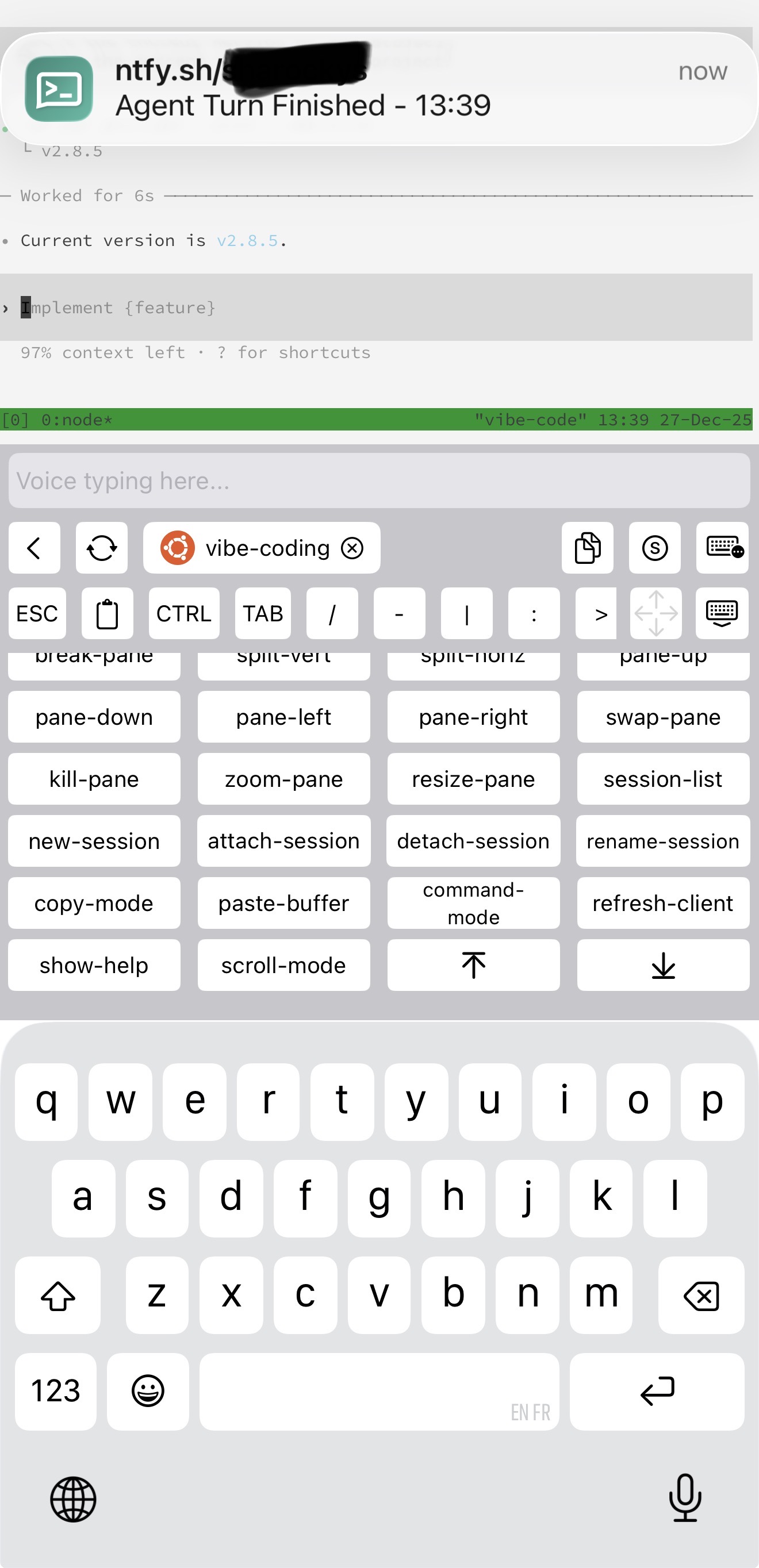 Now when you run an Agent task, you will get notified on your phone when it’s done. Very convenient for vibe coding on the go. This command suppresses the curl output to avoid cluttering the terminal but simply tell you that it’s your turn.